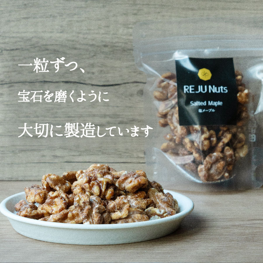 メープルシロップの自然な甘みと、ミネラル豊富な海塩のやさしい塩味が重なり、クルミ本来の香ばしさと味わいを引き立てます。