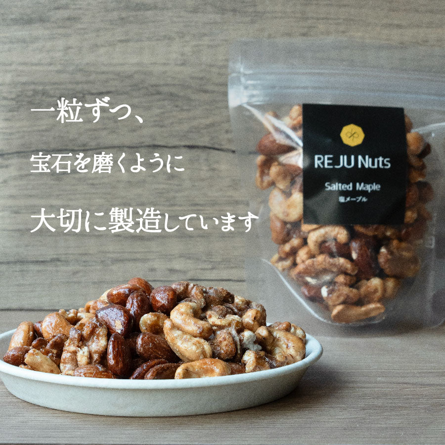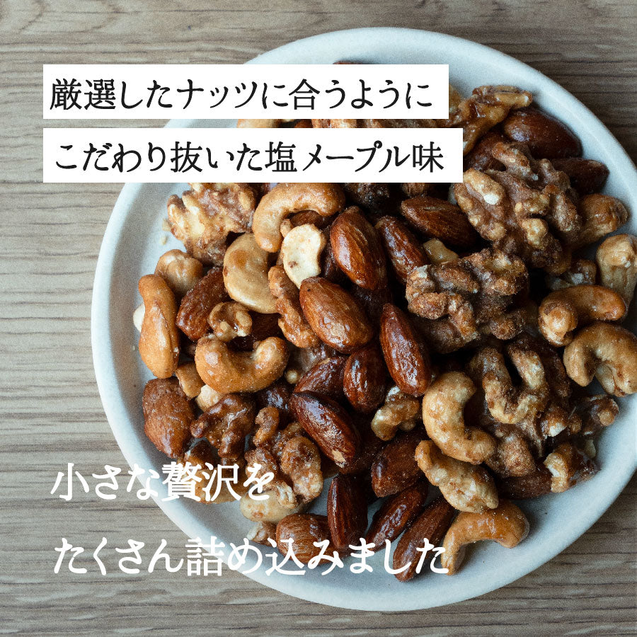 メープルシロップの自然な甘みと、ミネラル豊富な海塩のやさしい塩味が重なり、ナッツ本来の香ばしさと味わいを引き立てます。